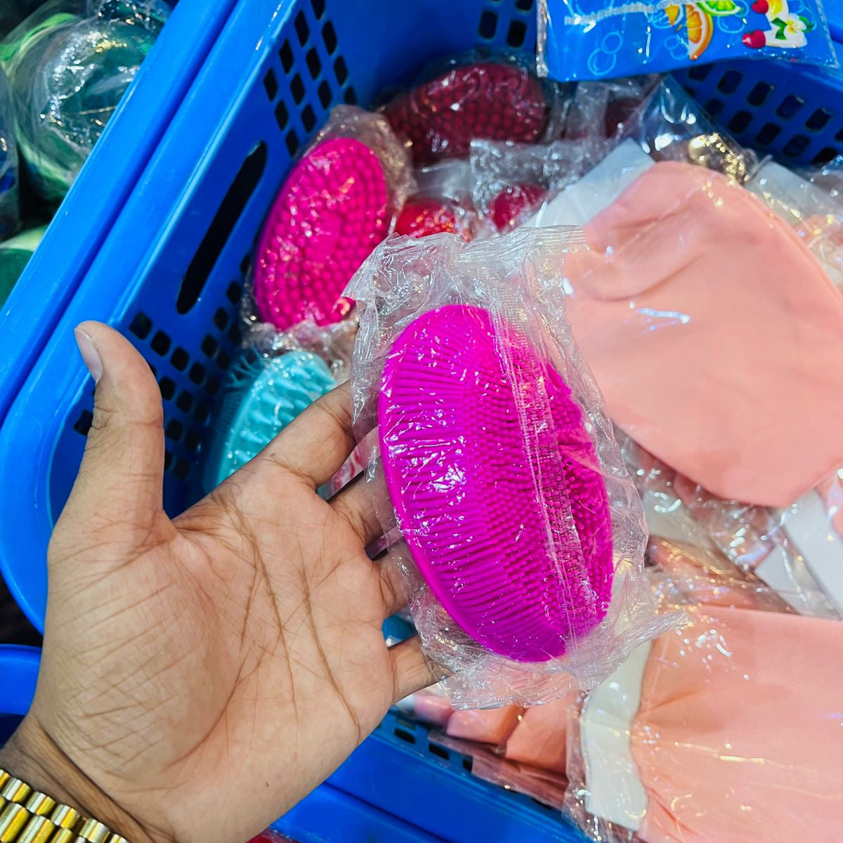 The scrubber has fine bristles on one side, typically used for cleaning dishes, fruits, or even for personal care such as body or face exfoliation. It’s lightweight and flexible, easy to grip in the hand. The item is displayed in a blue plastic basket along with other similar products in various colors like red, green, and blue. There are also other items, such as pink gloves and colorful plastic goods, visible in the basket.